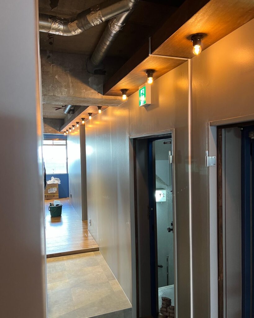 コンクリート打ち放しの既存躯体と、新設の内装が自然に調和するよう施工。
