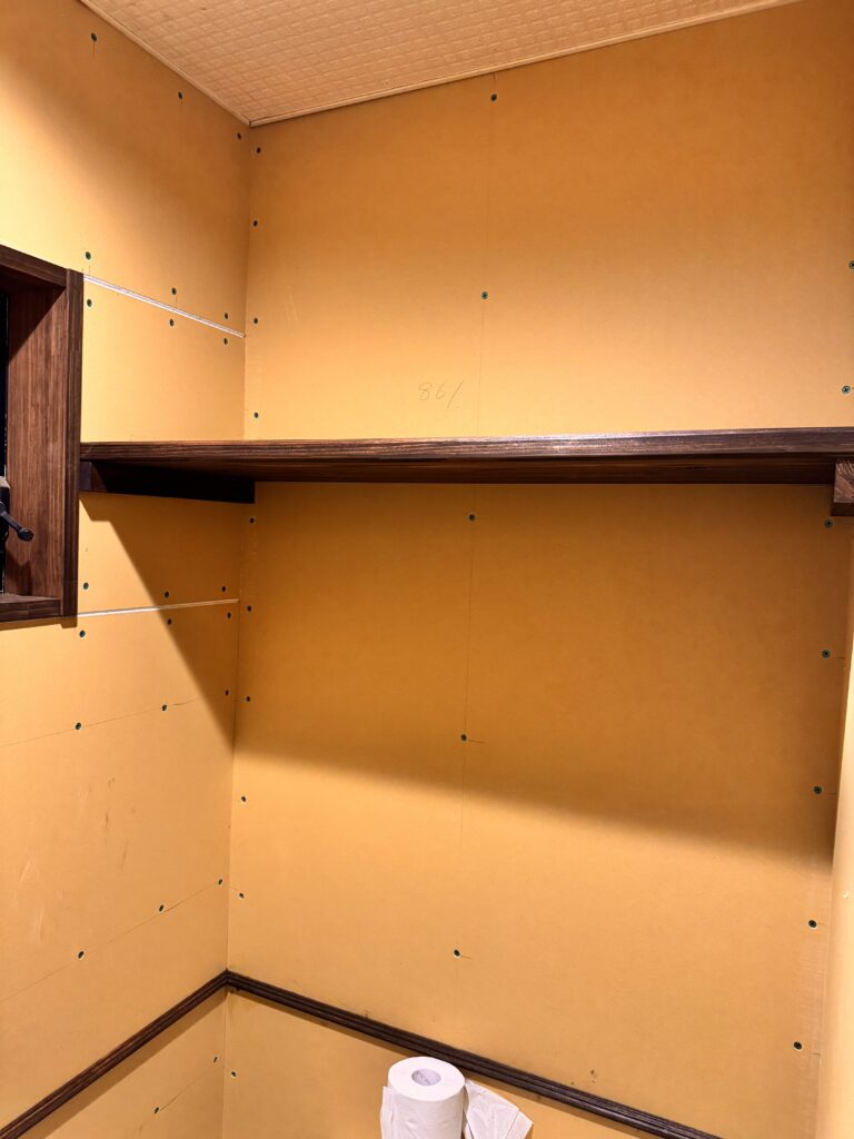まずはトイレ内のボード張替えから。既存の傷んだボードを丁寧に撤去し、下地を確認・補修。その後、新しいボードを張り、仕上げ処理を行いました。