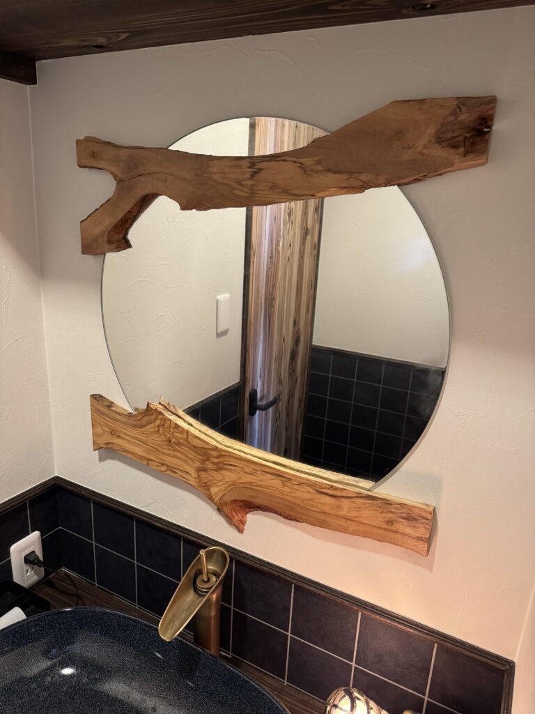 一枚板の力強い木目が、鏡に新しい命を吹き込みました。新しく作った洗面台とも相性抜群。